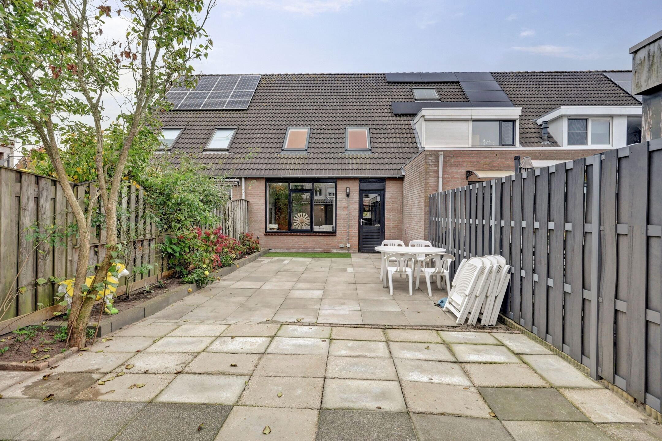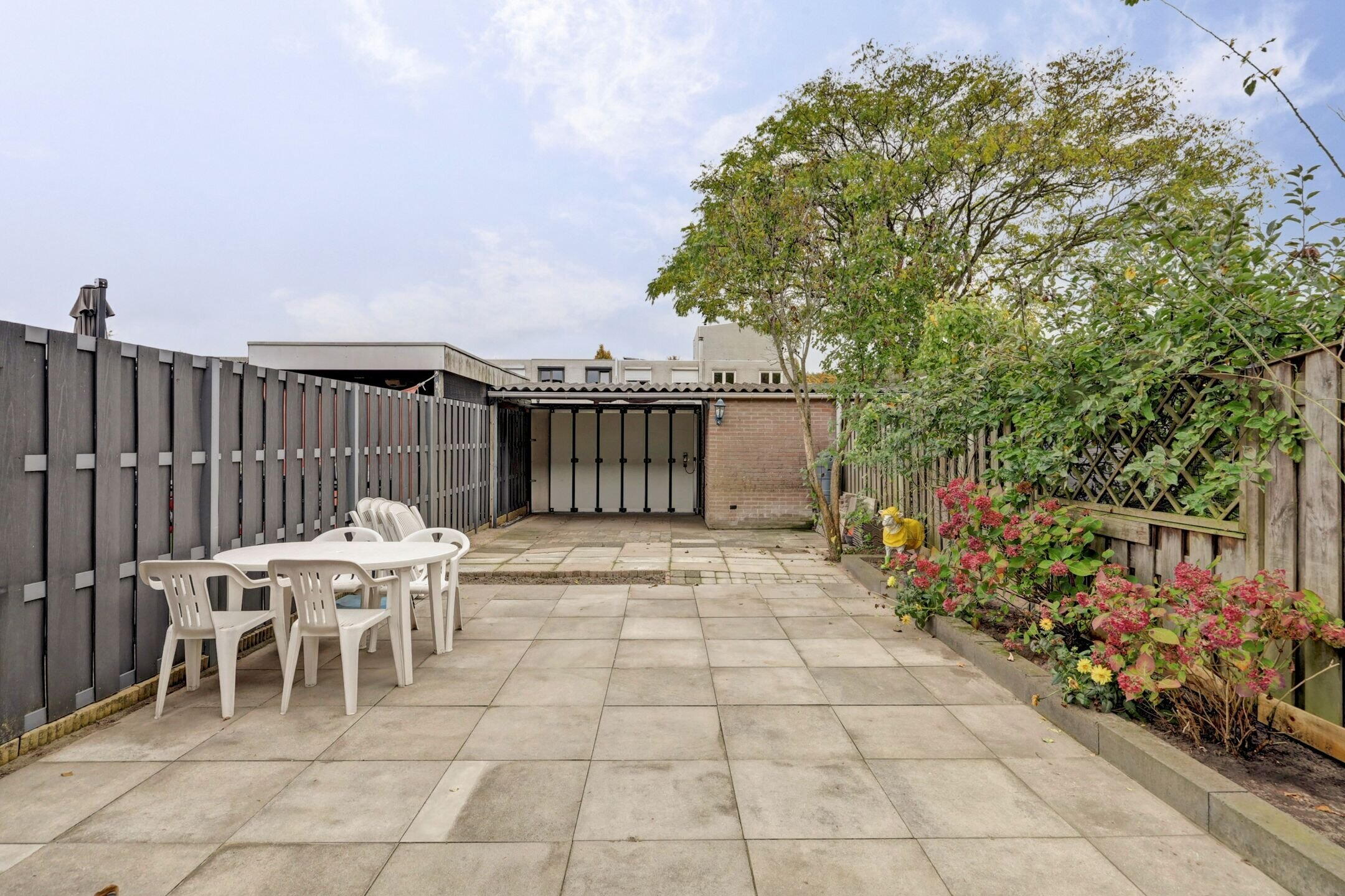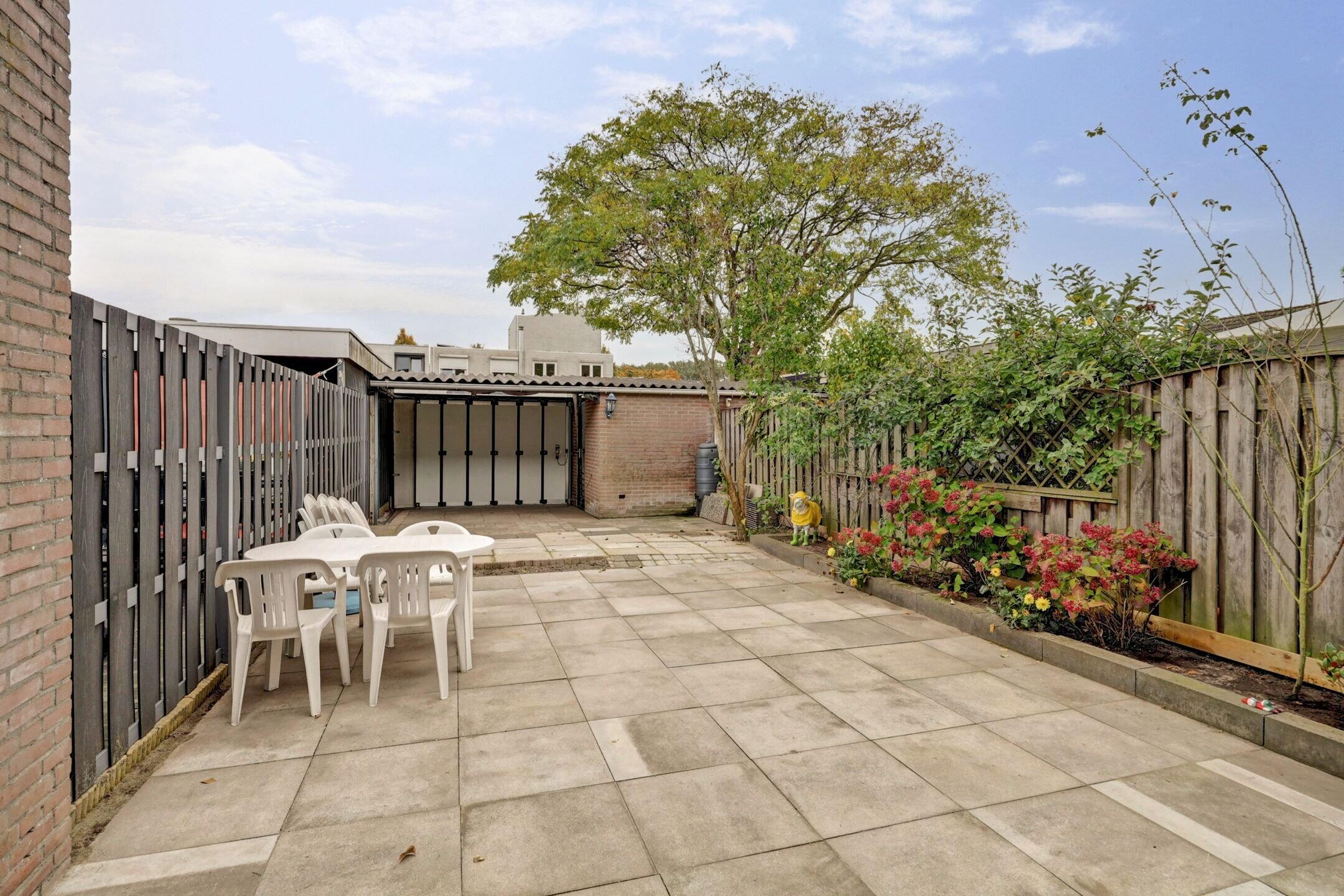 Ook buiten is het goed toeven. De zonnige achtertuin ligt beschut en biedt volop privacy. Fietsen kunnen veilig gestald worden in de berging en er is alle ruimte om lekker te tafelen, planten te poten of simpelweg te relaxen in het zonnetje. Je voelt je hier echt thuis.